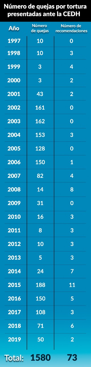En una mirada más global se registra que desde 1997 a 2019 víctimas de tortura presentaron mil 530 quejas ante la CEDH, pero sólo el 4.7 por ciento logró recomendación; de esas 72 recomendaciones menos del 10 por ciento se cumplen, según información obtenida por Cepad de la Comisión estatal. Es decir, sólo 0.5 por ciento de las mil 530 quejas presentadas fueron “cumplidas”, según la CEDHJ; para Cepad ese dato debería ser “cero” porque no ha habido sanciones a los responsables, afirma Denisse Montiel.