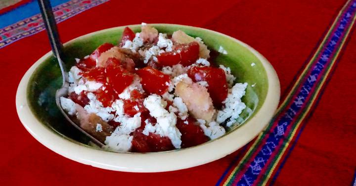 Mi versión de la ensalada citeriense incorpora un truquillo para lograr que el pan se empape más del agua del tomate, pero si vas con prisa, puedes hacer la mezcla saltándote este paso.