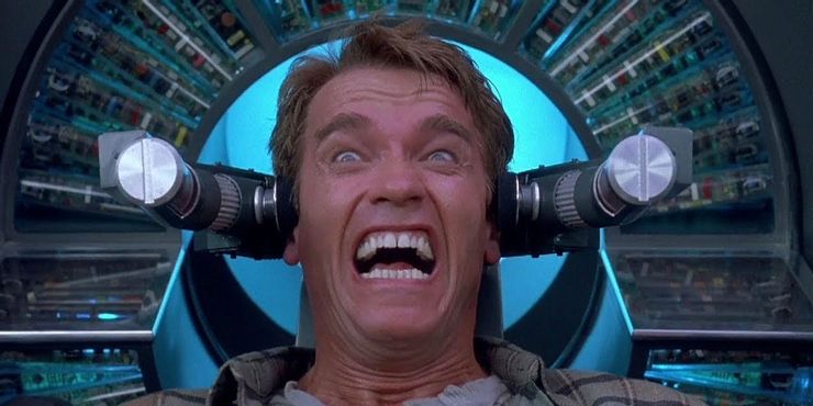 Arnold Schwarzenegger protagoniza Recuperación total como un trabajador de cuello azul en un futuro cercano que ha hablado de una empresa experimental que puede implantar recuerdos de vacaciones, lo que es más barato que irse de vacaciones.