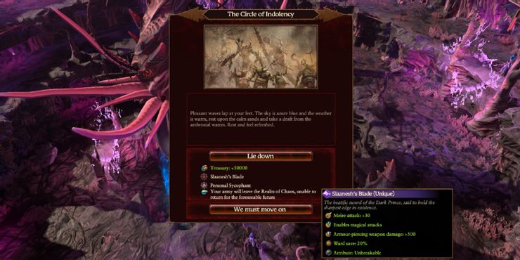 Hay dos versiones del Círculo de Indolencia en Guerra Total: Warhammer 3 y recargar un guardado reciente puede resultar en que Slaanesh no le ofrezca nada al jugador, lo que significa que la recompensa de este Círculo depende de la suerte. La versión más poderosa de Indolency ofrece al jugador Slaanesh’s Blade, el arma más poderosa del juego. Esta arma proporciona un 20 % de resistencia al daño, un enorme daño perforante de +500, un ataque cuerpo a cuerpo de +30 e irrompible mientras convierte los ataques cuerpo a cuerpo de la unidad en ataques mágicos. Esta arma es un hallazgo increíble para los jugadores que controlan a un poderoso señor o héroe cuerpo a cuerpo, como Skarbrand o uno de los señores dragón de Grand Cathay, ya que su unidad atraviesa a todos los enemigos como un cuchillo caliente a través de la mantequilla. El Círculo de la Glotonería y la Indolencia demuestran que Slaanesh es un maestro de la tentación, y los jugadores pueden obtener grandes beneficios para su campaña si sucumben a las ofertas del Príncipe Oscuro.