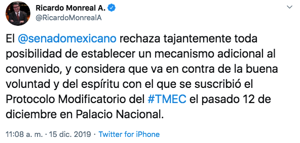 El senador Ricardo Monreal señaló que esto va en contra de la buena voluntad y del espíritu con el que este se suscribió el T-MEC el pasado 10 de diciembre en Palacio Nacional.