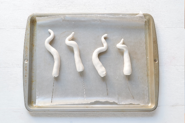 Cuando hayas terminado de hacer tus espeluznantes tentáculos caseros, forra la bandeja de metal para hornear con papel pergamino. Coloque los tentáculos en el papel de pergamino y hornee de acuerdo con las instrucciones del paquete. La mayoría de las marcas de arcilla para hornear requerirán un tiempo de horneado de 15 minutos por cada 1/4 de pulgada.
