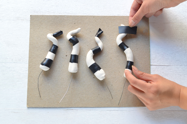 Una vez que se hayan enfriado, envuelva una tira de cinta alrededor de cada tentáculo. Esto bloqueará ciertas partes de cada pieza para crear un patrón de rayas en las decoraciones del césped de Halloween.