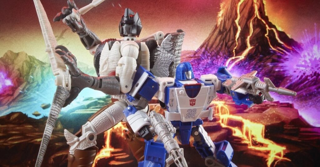 El juego incluye una figura de Autobot Mirage de 5.5 pulgadas inspirada en G1 que se convierte al modo de auto de carreras de la Tierra en 20 pasos. También hay un Grimlock máximo de 5.5 pulgadas inspirado en Beast Wars: Uprising que se convierte al modo raptor en 28 pasos. En cuanto a los accesorios, hay dos piezas bláster y la cola de Maximal Grimlock se separa del modo raptor para convertirse en 2 accesorios de espada.
