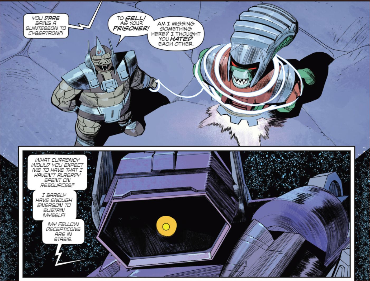 El recientemente lanzado Rivales del vacío #4 (por Robert Kirkman, Lorenzo de Felici, Matheus Lopes y Rus Wooten) expande el mundo al presentar al Decepticon Shockwave, quien quedó a cargo de Cybertron luego de la guerra entre los Autobots y los Decepticons. Después de que un cazarrecompensas Skuxxoid le ofreciera una recompensa por un Quintesson, Shockwave los rechaza a ambos. “¿Qué moneda esperarías que tenga que no haya gastado ya en recursos?” Pregunta Onda de Choque. “¡Apenas tengo suficiente Energon para sustentarme!“