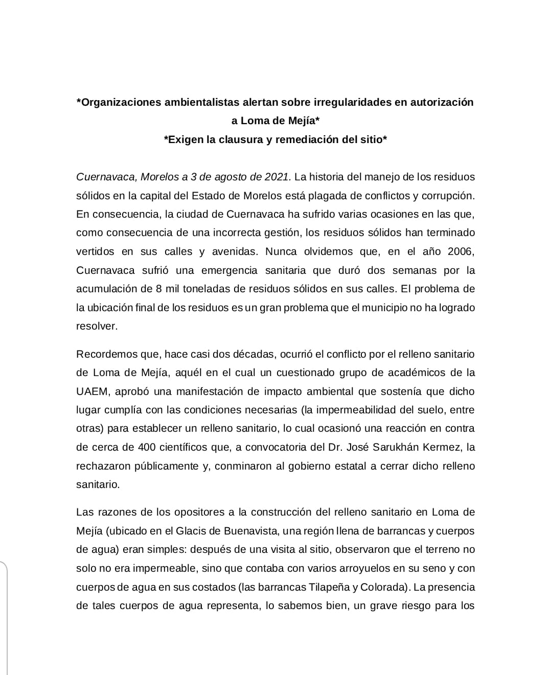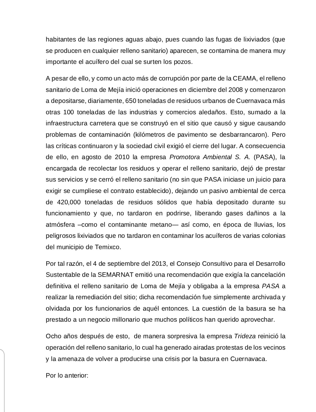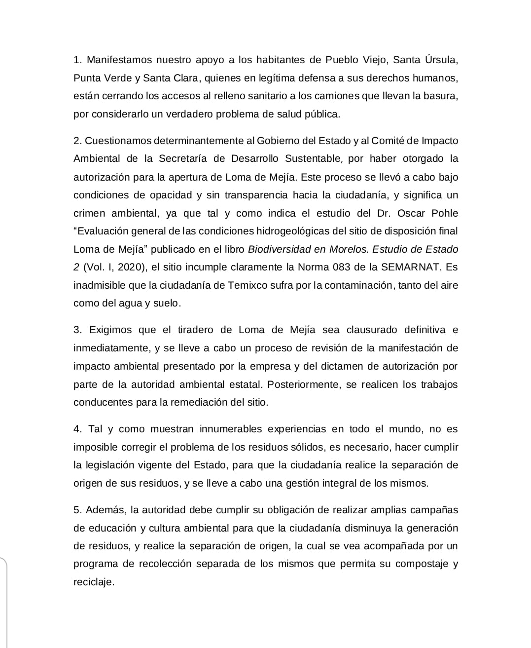 “Exigimos que el tiradero de Loma de Mejía sea clausurado definitiva e inmediatamente, y se lleve a cabo un proceso de revisión de la manifestación de impacto ambiental presentado por la empresa y del dictamen de autorización por parte de la autoridad ambiental estatal. Posteriormente, se realicen los trabajos conducentes para la remediación del sitio”, se lee en el escrito.