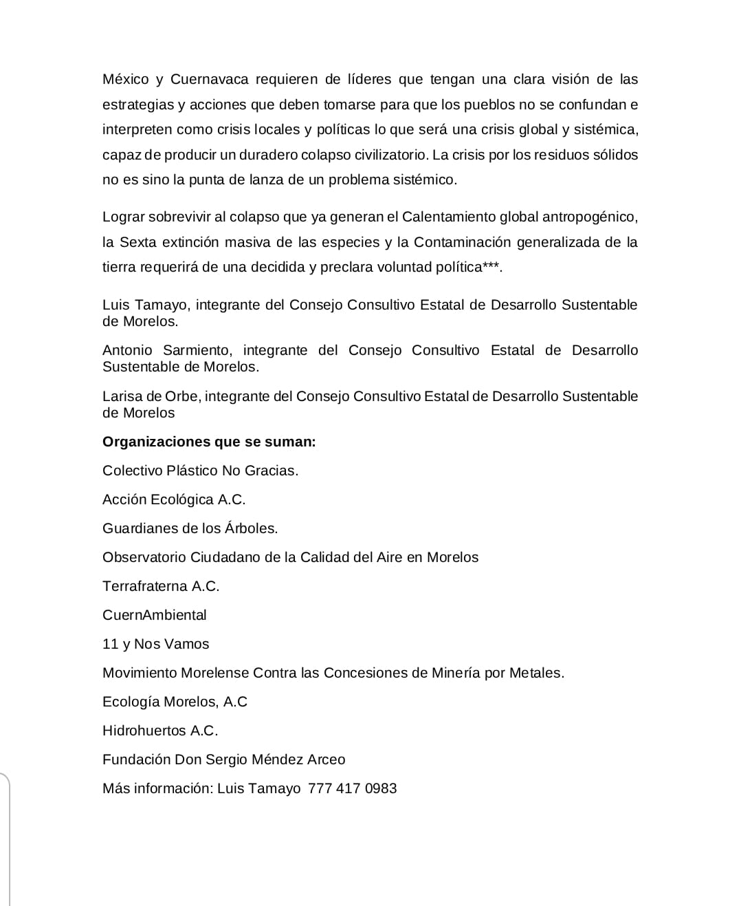Además, destacaron que existen sospechas de que la aprobación otorgada por la Secretaría de Desarrollo Sustentable(SDS) fue a modo, debido a que se dio en medio de la opacidad y falta de transparencia debido a que excluyeron durante todo el proceso al Consejo Consultivo Estatal de Desarrollo Sustentable de Morelos.
