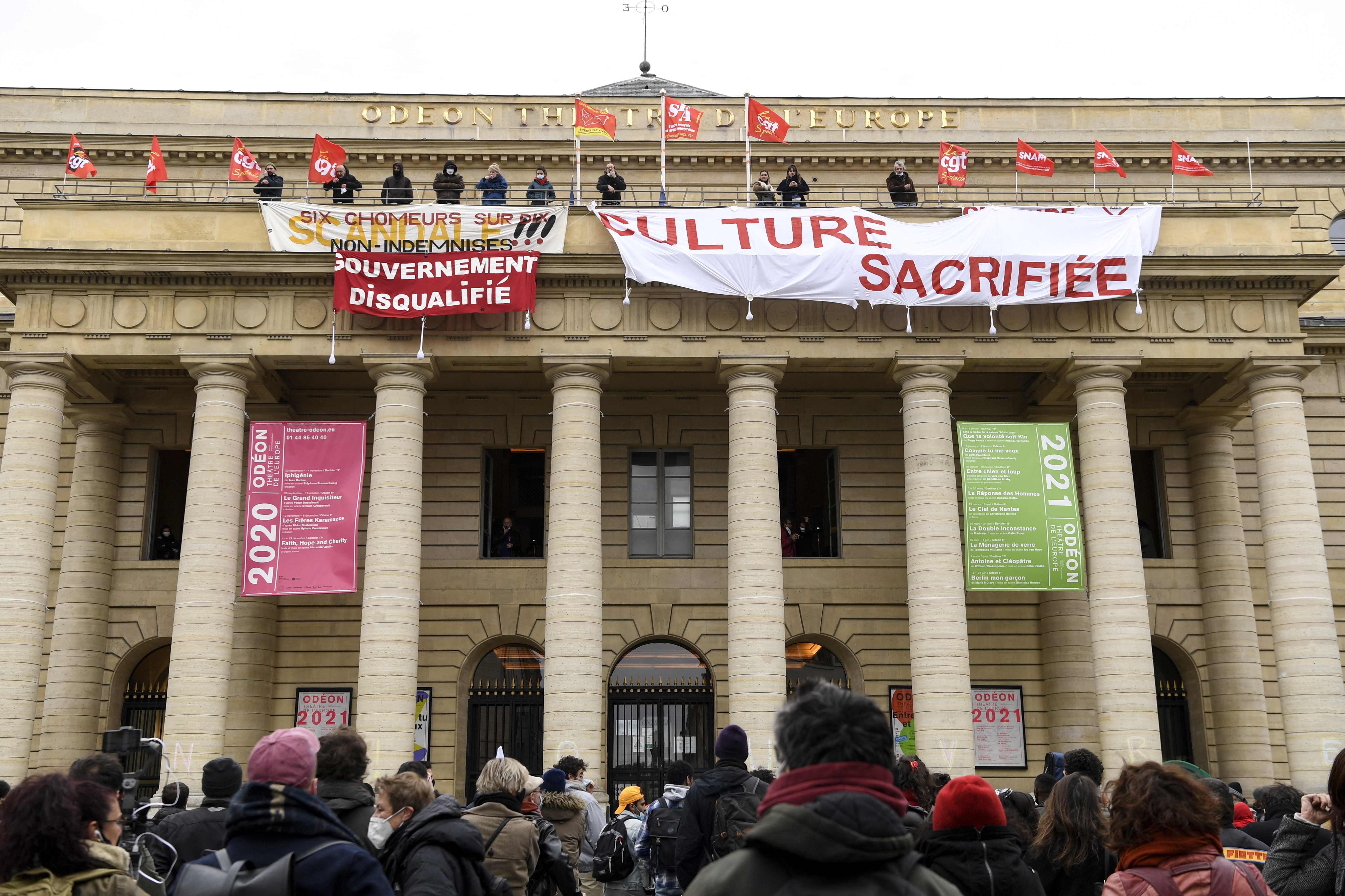 El Odéon seguirá ocupado. Y ya no está solo. Una semana después de que un grupo de artistas y otros trabajadores del gremio se instalara en el emblemático teatro de París, centro neurálgico de la revolución de mayo de 1968, el movimiento de ocupación de salas de espectáculo para reclamar más ayudas al sector por la pandemia se extiende por toda Francia. Ya son al menos siete las salas okupadas y los sindicatos han llamado este jueves a continuar y extender la protesta a otros teatros del país, tras rechazar por insuficientes las ayudas extras propuestas en una reunión con el Gobierno galo. También le reprochan que se niegue a fijar una fecha de reapertura de un sector totalmente paralizado desde hace más de cuatro meses.
