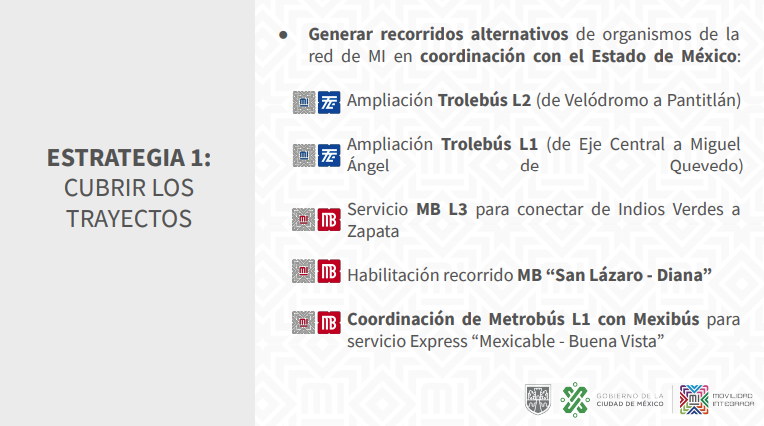 En la misma videoconferencia, el secretario de Movilidad, Andrés Lajous, anunció las estrategias para poder dar servicio alterno a los usuarios del Metro y con ello cubrir la demanda de 1.4 millones de viajes realizados en estas Líneas. Esto se hará con el apoyo de la Red de Movilidad Integrada en coordinación con el Estado de México.