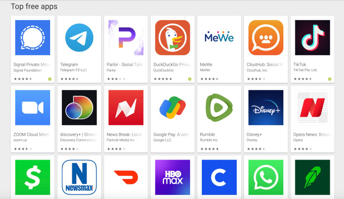 Luego está Rumble, una alternativa conservadora a YouTube. La aplicación ha obtenido un total de 2,4 millones de instalaciones globales desde su lanzamiento en enero de 2020, según las estimaciones de Apptopia. Desde el miércoles, eso incluyó 91,916 descargas nuevas, más de 73,700 de las cuales fueron en los EE. UU. También ha subido al número 78 en la App Store de EE. UU., Frente al número 1,484 del 19 de diciembre de 2020.