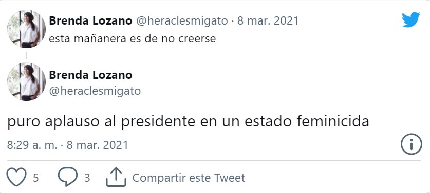 “Porque en este momento lo más urgente es estar de lado de los cambios que la sociedad anhela, que el presidente propone, y que día tras día construyen las mujeres y los jóvenes que como Brenda desean, más que nada, un México realmente democrático, sin discriminación y violencia contra las mujeres, los pueblos originarios, la sociedad pobre y marginada, y las inteligencias sociales y de nuestra cultura sin las cuales el mejor futuro es imposible”, finaliza su comunicación.