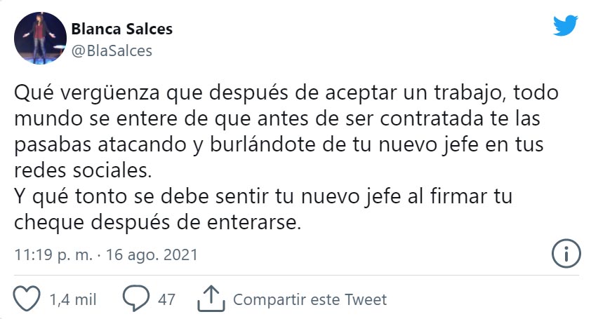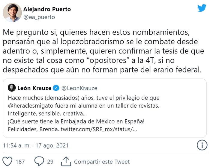Uno de ellos fue Ricardo Sevilla, quien preguntó a la ahora funcionaria: “¿Por qué decides aceptar un puesto en el Servicio exterior mexicano y representar a un gobierno al que, según tú, “no le importan las mujeres? ¿En tu nuevo puesto en la @SRE_mx ya no acusarás a AMLO, en @ElFinanciero_Mx, de que “ignora la emergencia feminicida”?.