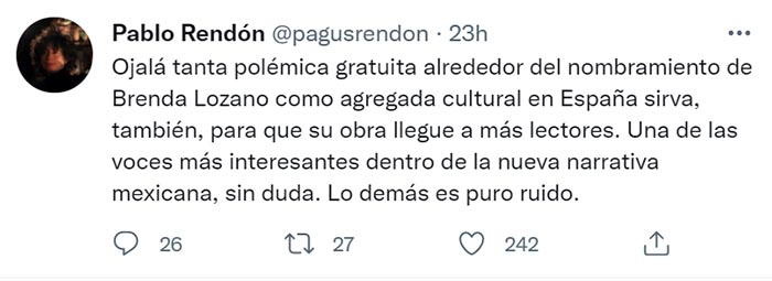 “Debido a los recientes y lamentables acontecimientos que se suscitaron por la decisión de dar por terminada la Comisión del Agregado Cultural de la Embajada de México en España, Jorge F. Hernández, y por el nombramiento de Brenda Lozano para sucederle en el cargo, considero que mis espacios de acción e interlocución con la comunidad cultural ya no son los de antes”, aseguró.