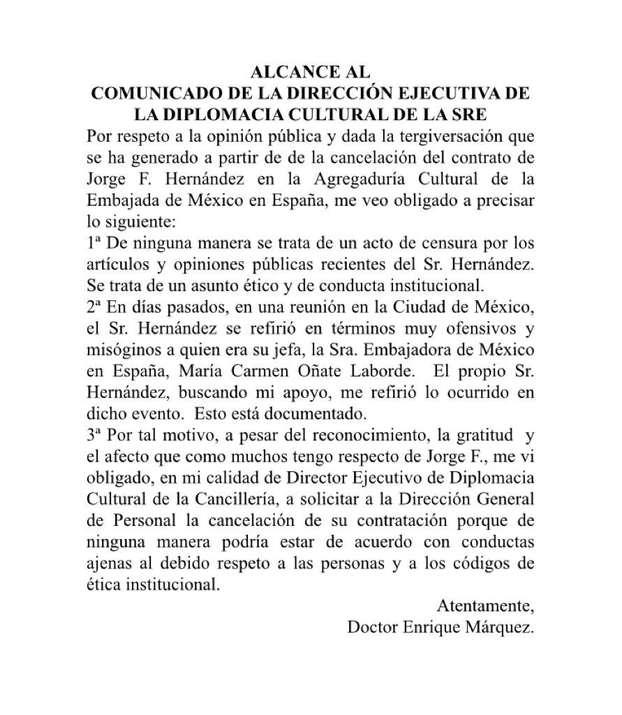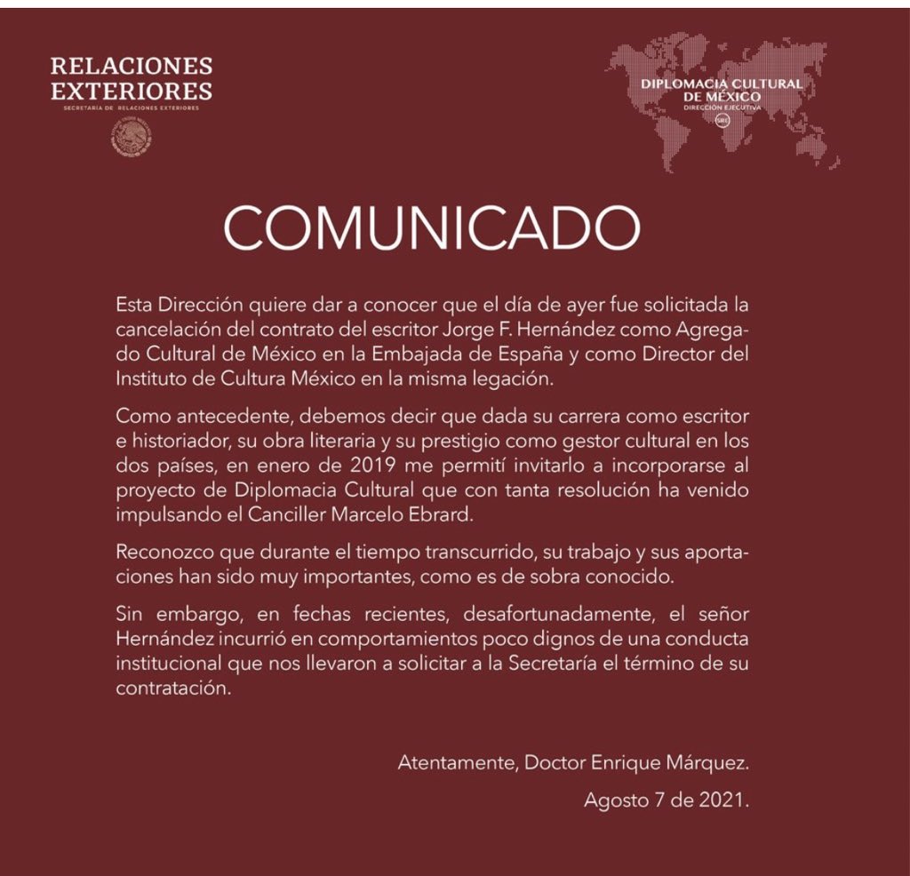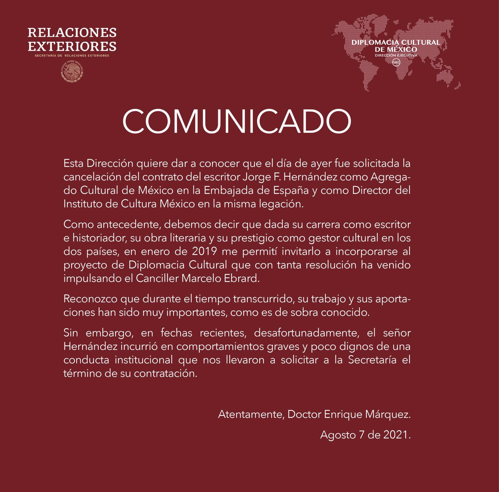 Previamente, la Secretaría de Relaciones Exteriores (SRE) destituyó el pasado 7 de agosto al escritor Jorge F. Hernández como agregado cultural de la embajada de México en España y director del Instituto de Cultura de México en Madrid, por haber incurrido en fechas recientes “en comportamientos poco dignos de una conducta institucional”.