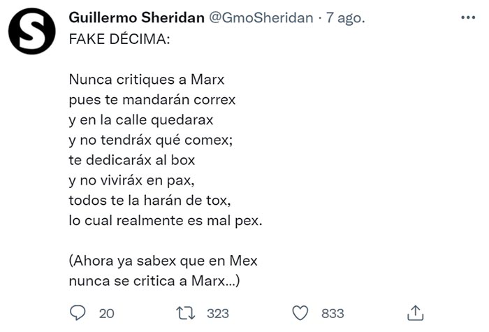 El escritor Guillermo Sheridan publicó en su cuenta de Twitter una décima de apoyo a Hernández y en la que critica su destitución.