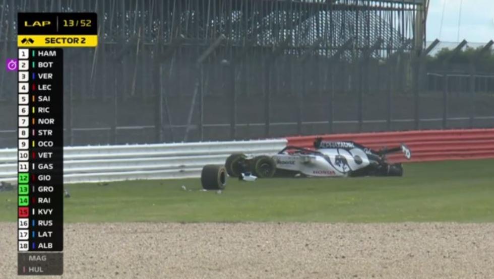 En la vuelta 13 del GP de Gran Bretaña de Fórmula 1, Daniil Kvyat sufrió un fuerte accidente en la entrada a las famosas enlazadas de Silverstone, donde los coches de F1 llegan a unos 315 km/h. En ese instante, el piloto ruso de Alpha Tauri perdió el control de su monoplaza y se fue directo contra las barreras protectoras del trazado inglés.