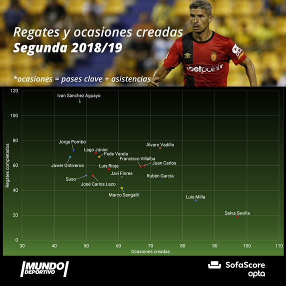 En las estadísticas relacionadas con los regates, resulta muy interesante comprobar si tras un regate se generó una ocasión de peligro. Iván Sánchez (Elche) es el jugador con más desborde con más de un centenar de regates, pero sus jugadas no pudieron llegar al 50% de materializarse en una ocasión de peligro. En el sentido opuesto se encuentra Salva Sevilla (Mallorca), con apenas 20 regates, pero que con sus pases ha generado casi cien ocasiones de peligro. El jugador más completo en este aspecto es sin duda Álvaro Vadillo (Granada). Ha completado casi 80 regates y de sus botas se ha generado más de 70 ocasiones de peligro.
