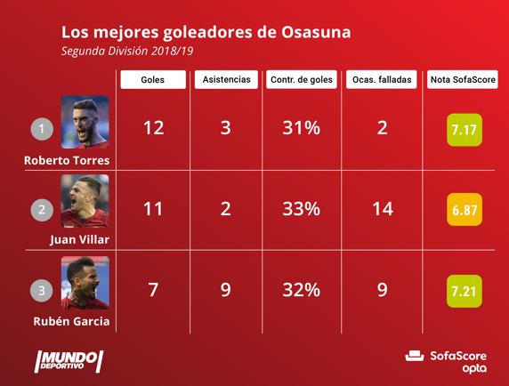 Osasuna ha sido el primer equipo en lograr el ascenso a Primera. Los de Jagoba Arrasate son el equipo más goleador de la categoría pero, curiosamente, el 96% de sus 52 tantos han sido anotados por únicamente tres jugadores: Roberto Torres (12), Juan Villar (11) y Rubén García (7).