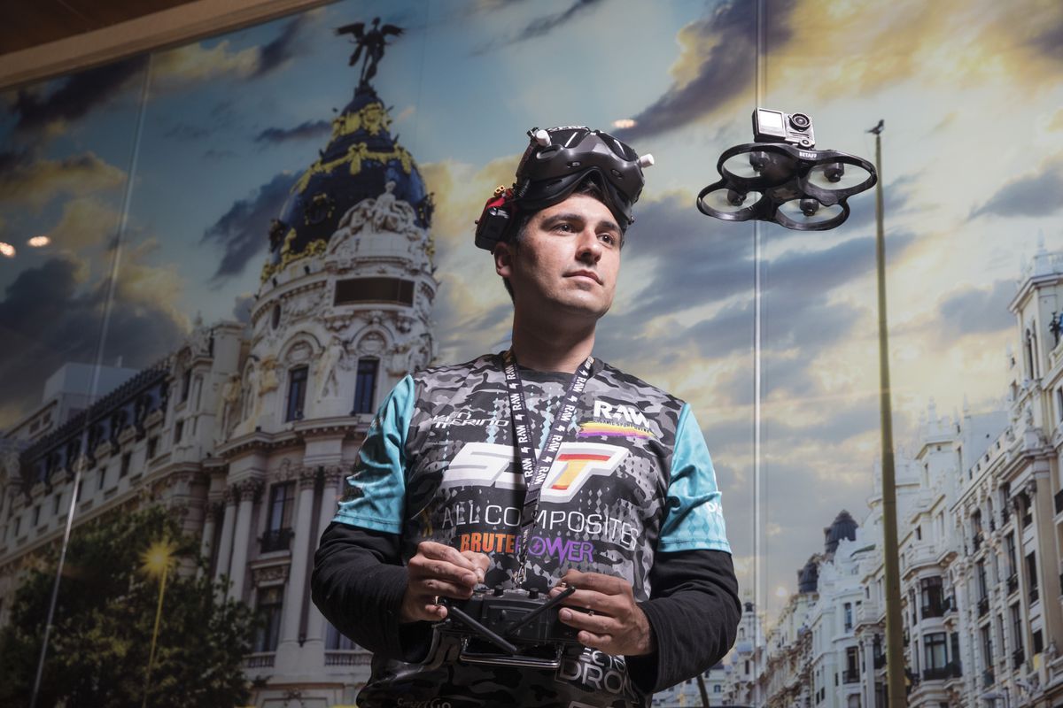 Iván Merino, piloto de drones acrobáticos de 28 años, uno de los mejores de España, acaba de volver al hotel tras intervenir en un conocido programa de televisión. En directo, su ágil y ligera máquina pasó a escasos centímetros de una llama de 20 metros y se coló entre las piernas de Pablo Alborán. Después cogerá un tren hasta Jimena de la Frontera (Cádiz), su pueblo natal, de unos 10.000 habitantes, donde reside y entrena tres veces a la semana en el estadio de fútbol municipal. Al día siguiente viajará a otros estadios, los grandes templos de la LaLiga Santander, para cumplir el reto de grabar a 100 km/h imágenes inéditas de todos ellos. Pero ahora, mientras es fotografiado, hace volar el dron alrededor de su cabeza sin inmutarse, como si fuera un satélite orbitando. Y pide con una risa que quede claro que el fondo sobre el que es retratado, una pintura de la Gran Vía madrileña, es ficticio. Volar al aire libre estas máquinas requiere obtener una licencia. Aparte de pericia y mucha concentración.