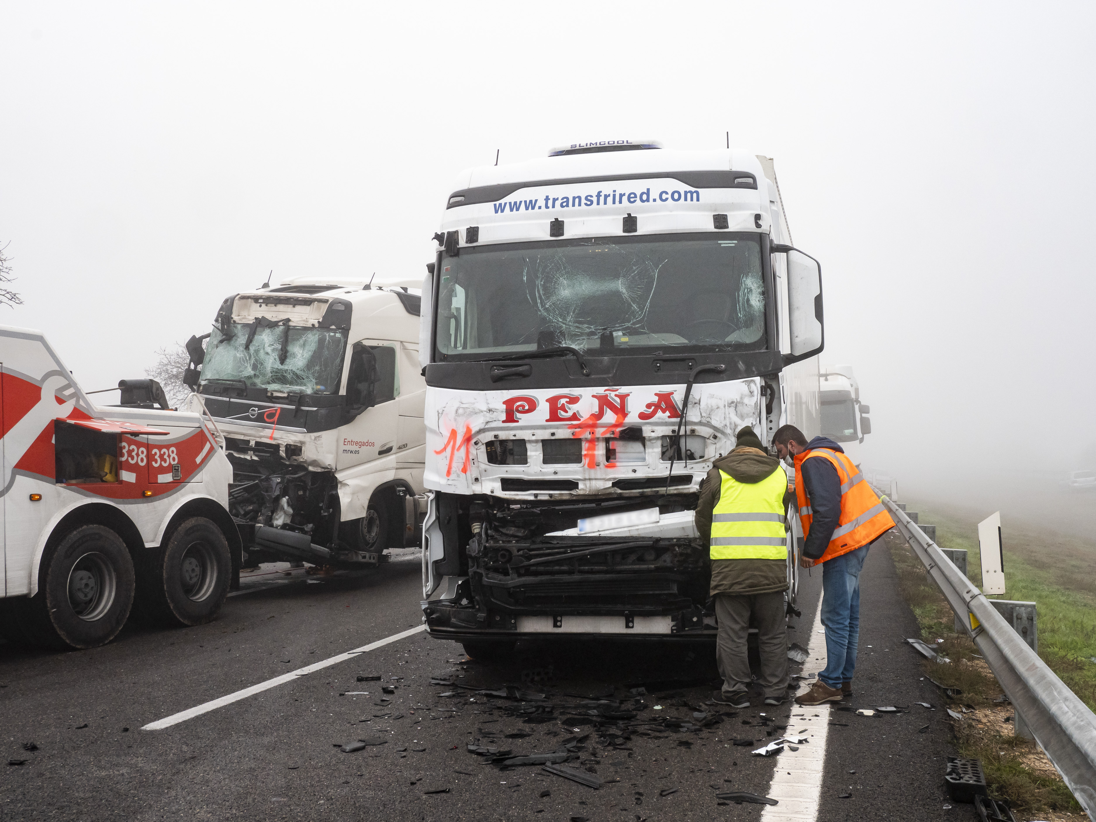 Tres personas han muerto en un accidente de tráfico múltiple en la autopista AP-2 a la altura de Castelldans (Lleida) ocurrido a primera hora de la mañana de este viernes. Otras nueve personas han resultado heridas. La mala visibilidad por la niebla está detrás de un siniestro en cadena en el que se vieron implicados 25 vehículos entre turismos y camiones, según los Bomberos de la Generalitat.
