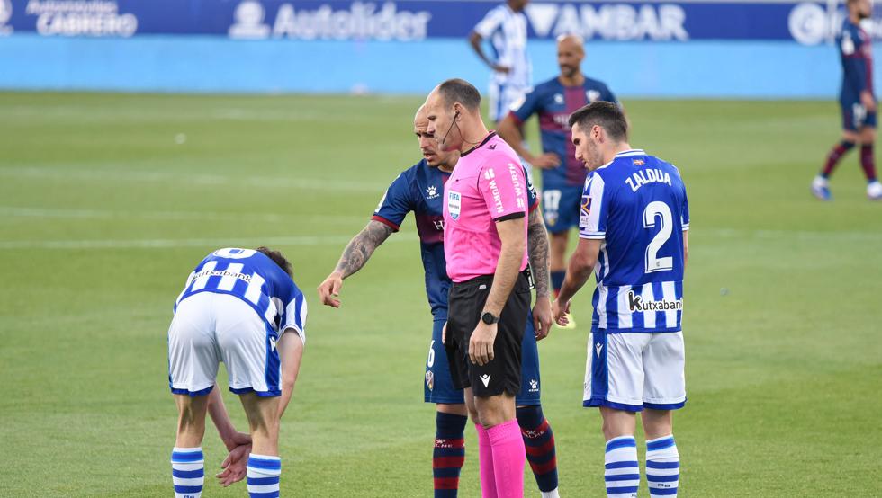 Lahoz nada más finalizar el partido, a vueltas con el gol del Huesca a cuatro minutos para que se cumpliera el tiempo. Escoció el modo en que la Real perdió el punto que agarraba en El Alcoraz. La expedición retornó dolida de Aragón.