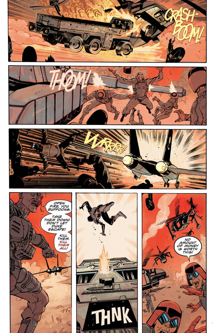 Proveniente del equipo creativo de Joshua Williamson, Tom Reilly, Jordie Bellaire y Rus Wooton, Duque #4 encuentra a Duke y sus aliados inmovilizados en el Pozo por un equipo de soldados bajo las órdenes de Destro. Sin munición y sin poder pedir refuerzos, el heterogéneo grupo de héroes decide descender más a las profundidades del Pozo, donde encuentran una sorpresa inesperada.