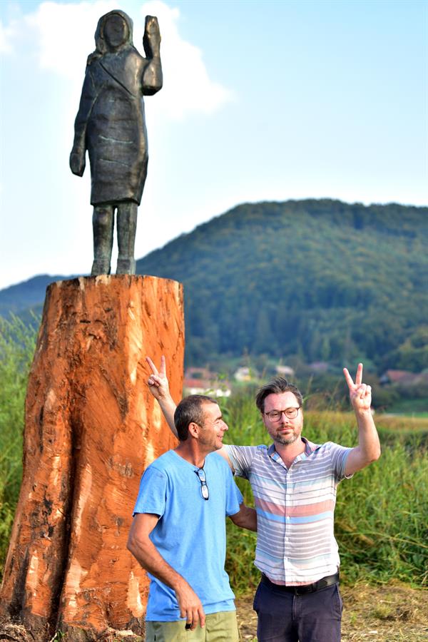 Inauguración de la estatua de la primera dama estadounidense Melania Trump por los artistas Bred Downey (R) y Ales ‘Maxi’ Zupevc en su lugar de nacimiento en Sevnica, Eslovenia, 15 de septiembre de 2020.