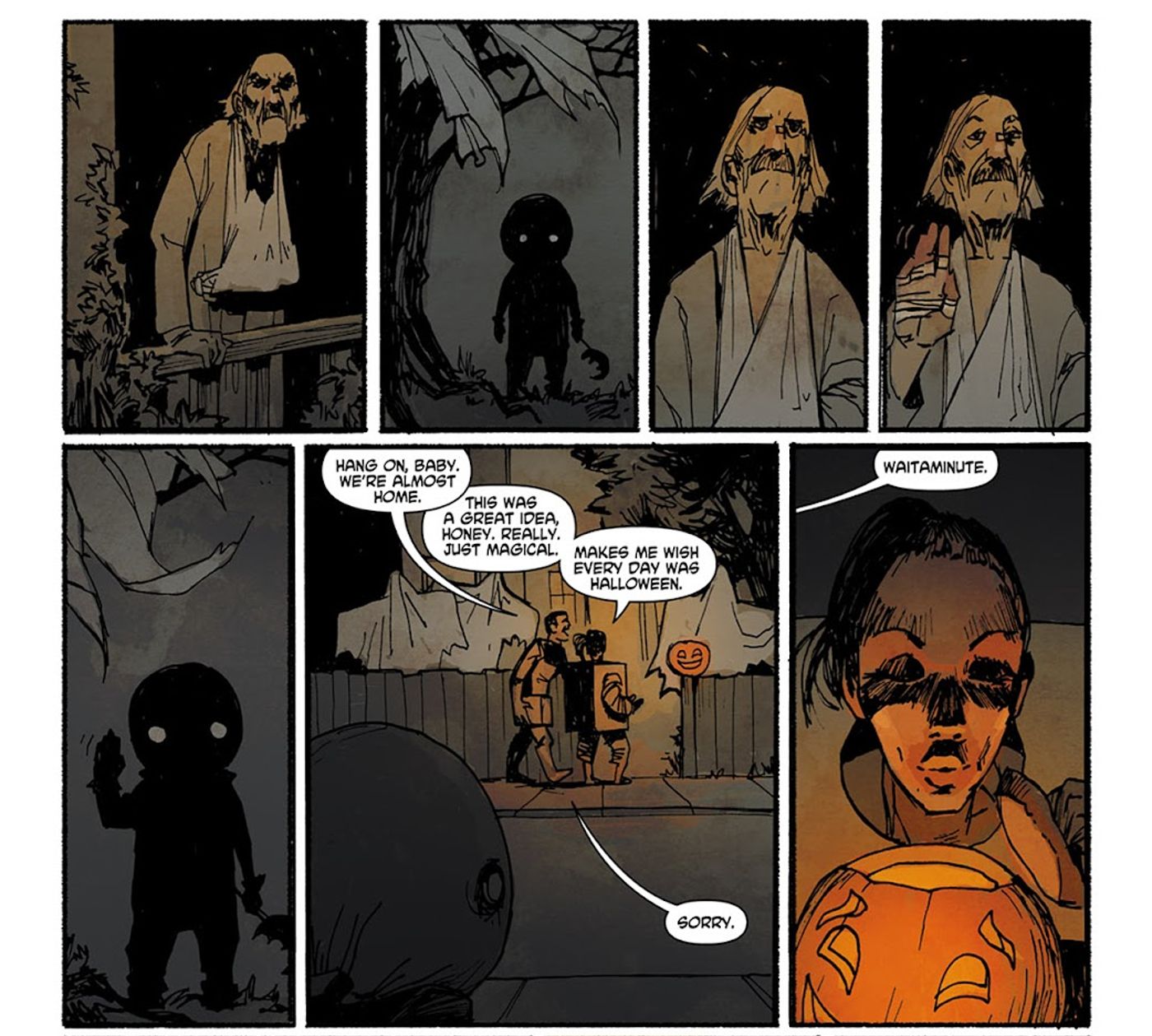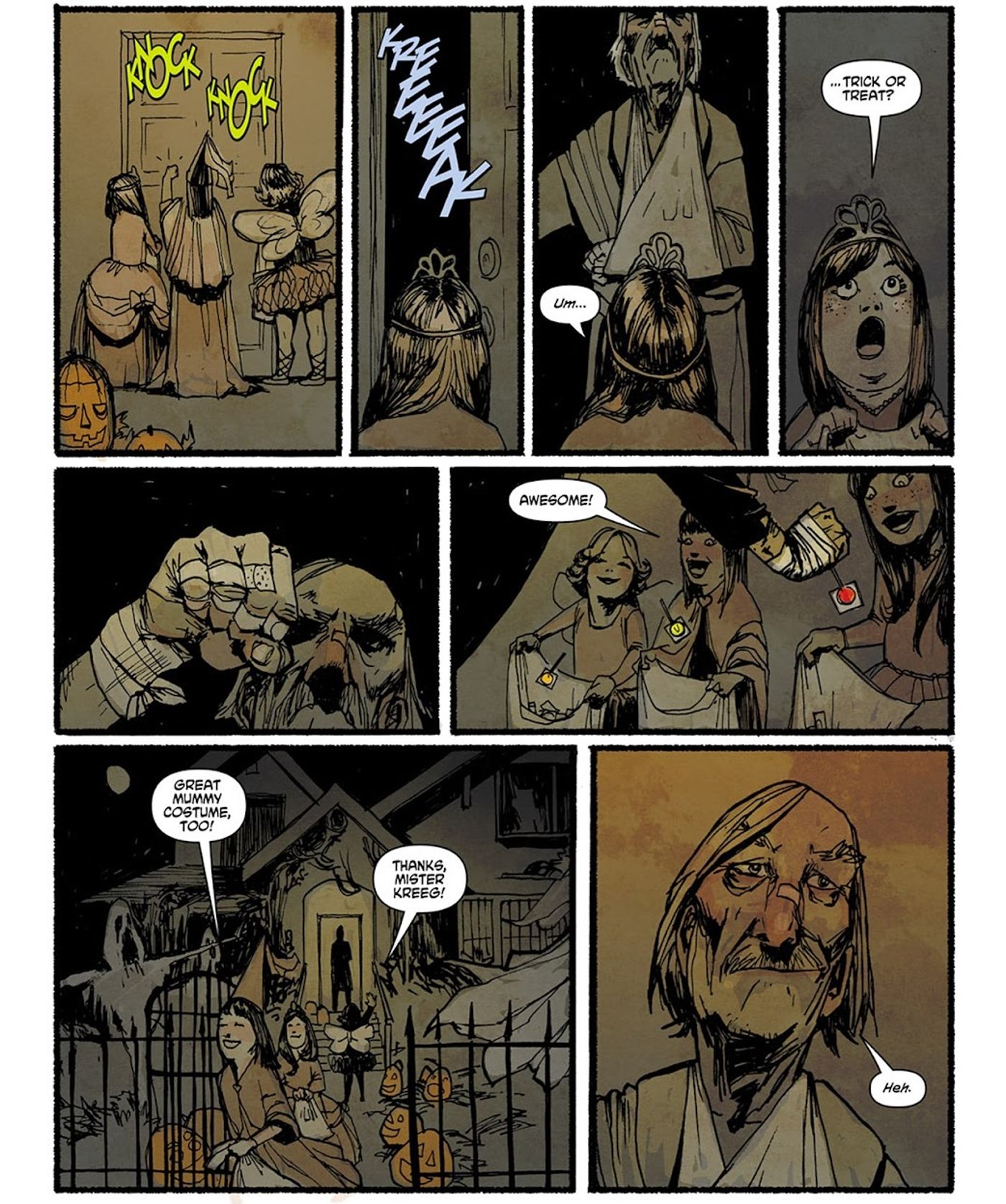Dulce o truco #4 de Marc Andreyko y Fiona Staples adapta completamente la historia final de la película en la que el demoníaco Sam, el “Trick-or-Treater”, ataca a un anciano llamado Mr. Kreeg por su falta de espíritu de Halloween. En su mayor parte, la historia se desarrolla de la misma manera que en la película. Se cambian algunos pequeños detalles aquí y allá, pero nada que uhttps://.com/trick-r-treat-sam-origin-sequel-prequel-spinoff/ltimamente destaque. Sin embargo, todo eso cambia en las páginas finales del cómic.