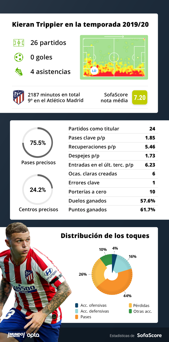 , Trippier es el noveno jugador más usado por Simeone. Que no es poco tampoco porque tuvo que parar por una operación de pubalgia y se ha perdido este curso siete partidos, más otros cinco partidos por decisión técnica.