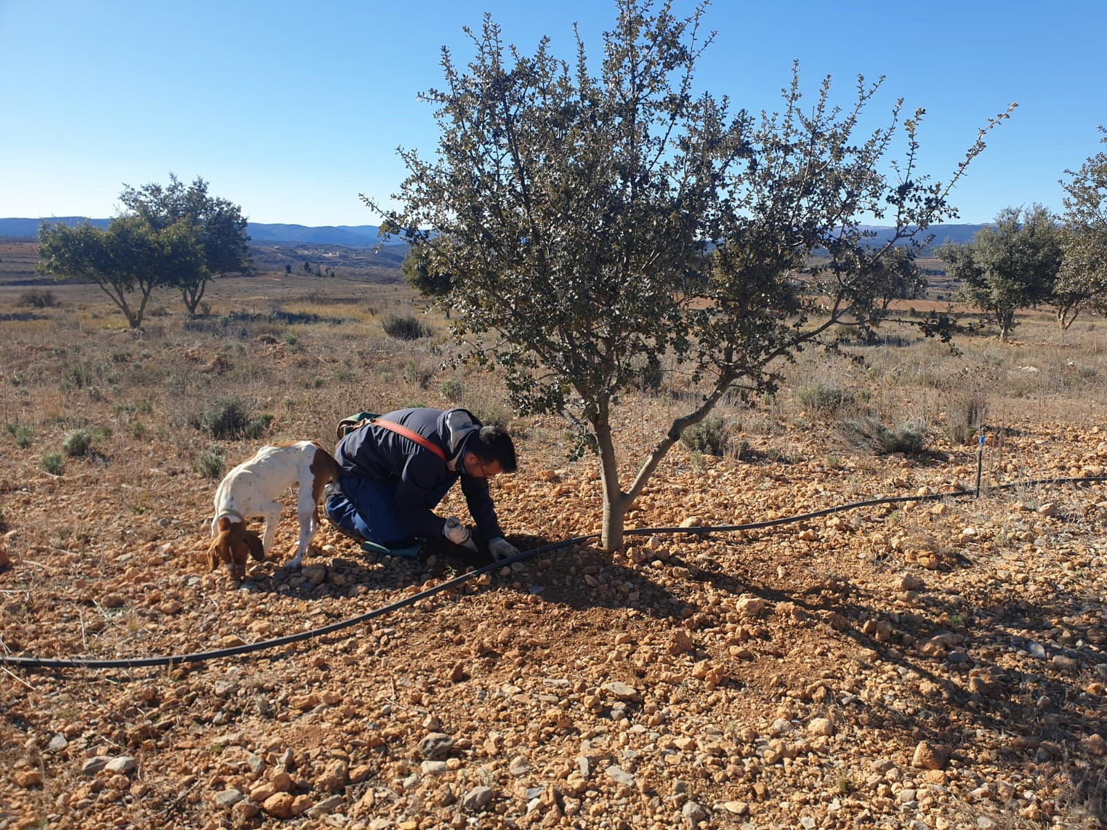 El olfato canino es el mejor aliado para detectar trufa negra bajo tierra cuando ha madurado. “Los perros son auténticos compañeros de faena”, asegura Daniel Bertolín. “Los tenemos muy bien cuidados y alimentados, con piensos de muy alta calidad porque trabajan como una persona y a muy bajas temperaturas”. Y sobre todo “muy mimados, porque un perro no trabaja por obligación, sino por cariño”. Los canes pasan por un periodo de adiestramiento y se los enseña a asociar el olor de la trufa a una recompensa, ya sea en caricias, juegos o comida.