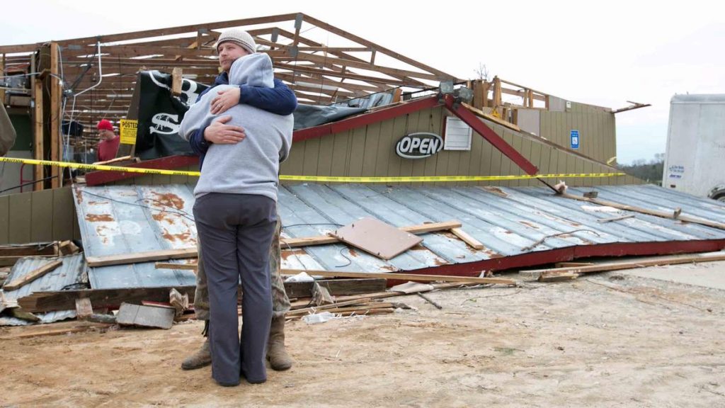 De acuerdo con el Servicio Nacional Meteorológico, una decena de tornados tocaron tierra en la tarde del domingo en los estados de Alabama y Georgia, con vientos de entre 133 y 164 millas por hora.