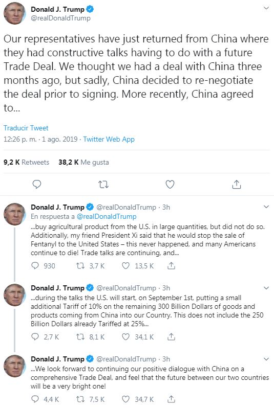 “Estados Unidos comenzará el 1 de septiembre imponiendo un pequeño arancel adicional del 10 por ciento sobre los 300 mil millones de dólares restantes de bienes y productos procedentes de China a nuestro país”, indicó Trump en un mensaje a través de la red social Twitter.