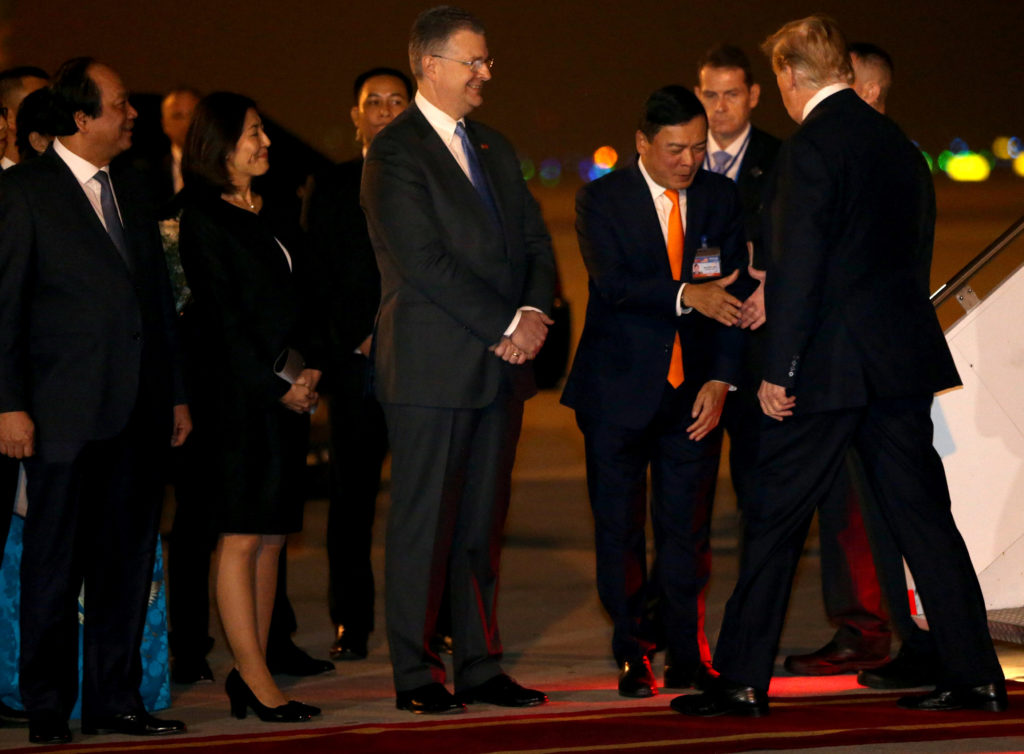 Vestido con un traje oscuro, camisa blanca y corbata azul, Trump fue recibido en el aeropuerto por altos funcionarios del gobierno vietnamita y miembros del Ejército, así como por el embajador de los Estados Unidos en Vietnam, Daniel Kritenbrink, según reporte de la agencia vietnamita VNA.