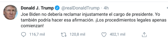 “Joe Biden no debería declarar injustamente que ha ganado la oficina de la Presidencia. Yo también podría hacer esa declaración. ¡Los procedimientos legales acaban de empezar!”, escribió Trump.