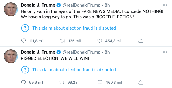 Aproximadamente una hora después, Trump escribió: “Sólo ganó a los ojos de los MEDIOS DE COMUNICACIÓN DESHONESTOS. ¡No concedo NADA! Tenemos un largo camino por recorrer. ¡Esta fue una ELECCIÓN MANIPULADA!”.