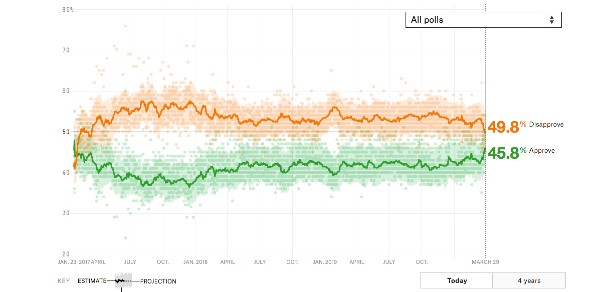 En el marco de la pandemia por coronavirus Covid-19, el presidente de Estados Unidos Donald Trump alcanzó un nivel récord de popularidad, al contar con el 45.8% de respaldo de la población estadounidense, según datos del sitio de análisis FiveThirtyEight.