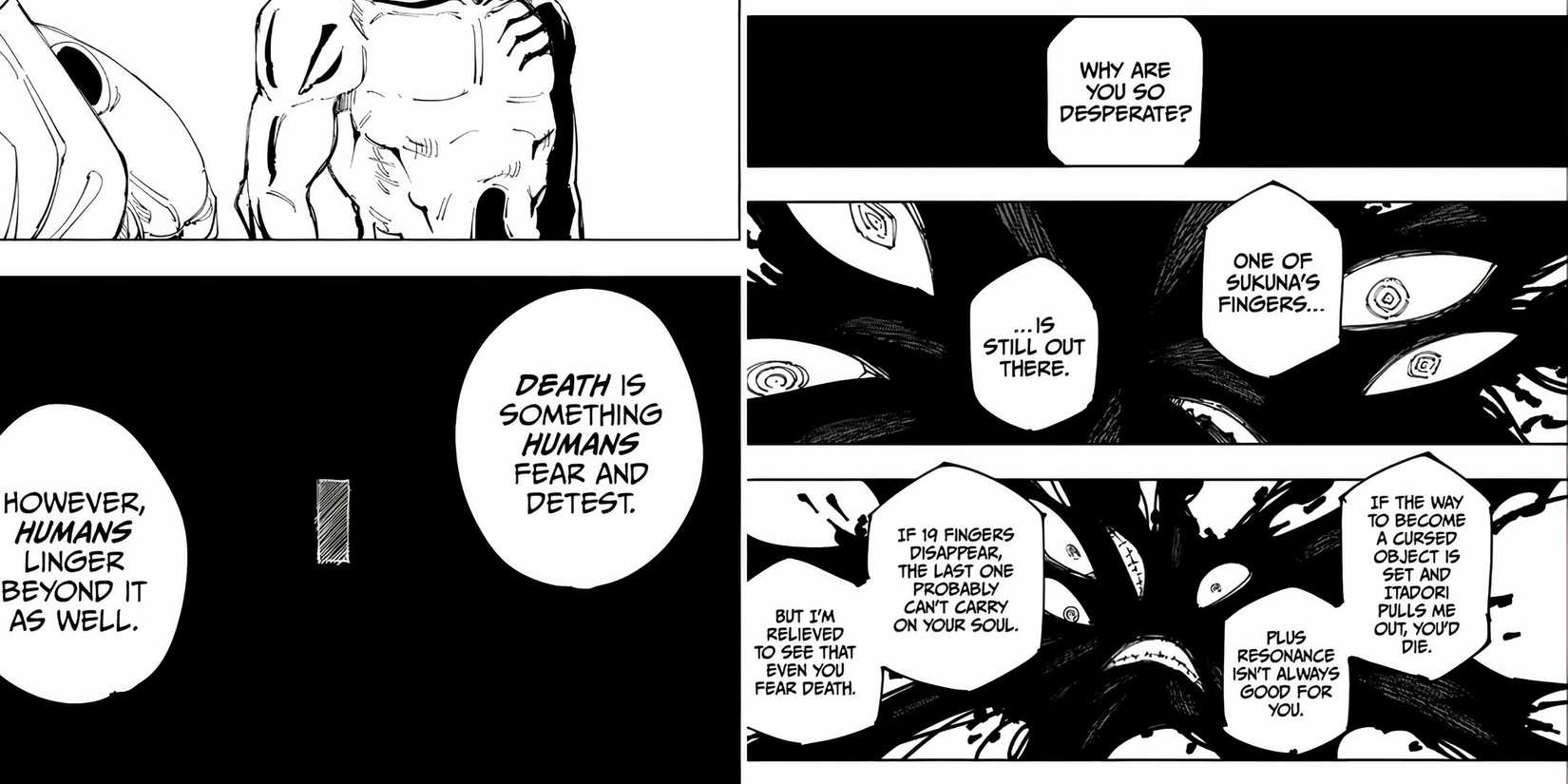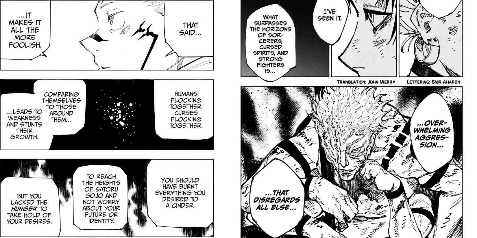 Ya en el capítulo 21, Mahito habla con Junpei sobre no atenerse a una filosofía restrictiva y le dice que coma si tiene hambre y que mate si odia a alguien. Sukuna refleja el mismo sentimiento en el capítulo 248 cuando afirma que come cuando quiere, juega con lo que le divierte y mata a quien se interponga en su camino.