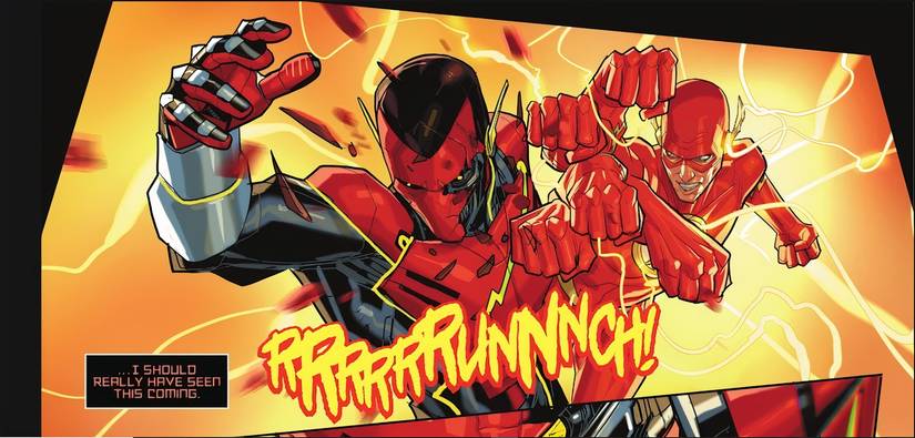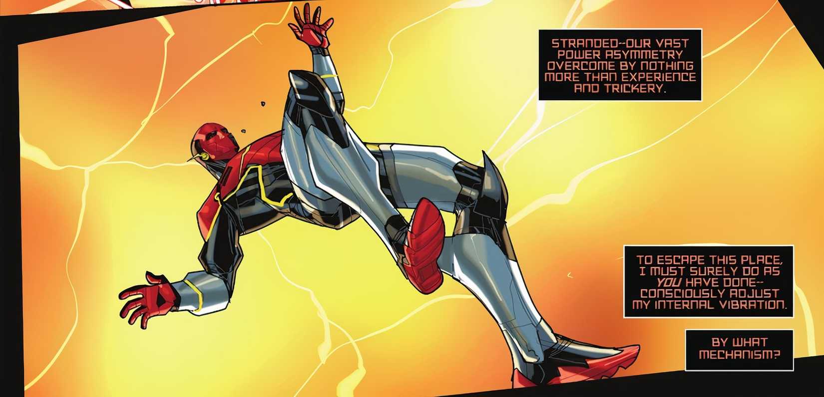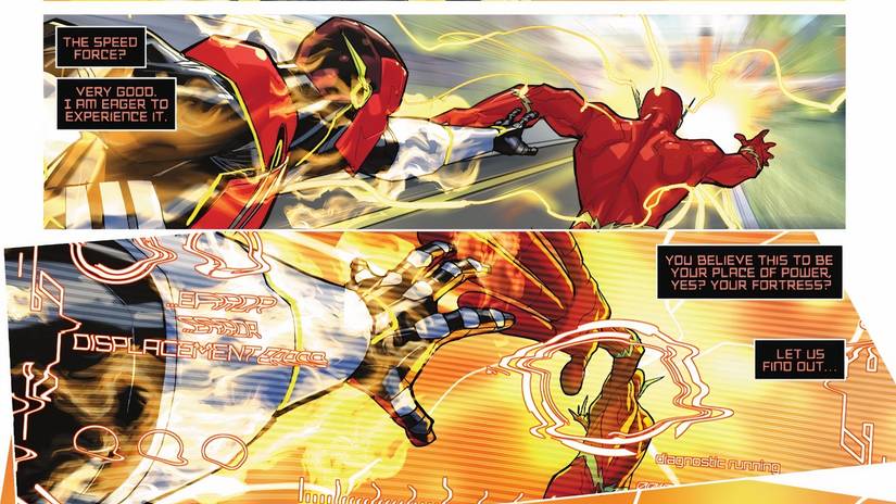 A pesar de que Velocity tiene la velocidad y las habilidades del resto de la familia Flash y es significativamente más rápido, Barry logra evadir la captura usando su ingenio y experiencia para burlar a Amazo. En un momento dado, Barry incluso se desliza hacia la Fuerza de la Velocidad para poner algo de distancia entre él y Velocity. Durante esta persecución, Amazo hace un comentario sugiriendo que Speed Force es en realidad la base secreta de Barry..