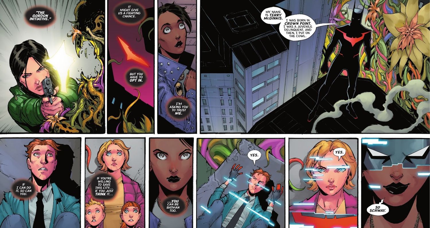 Terry McGinnis tiene un momento similar, uno que expone su identidad secreta al mundo en el proceso, en Batman del futuro: neogótico #6 por Collin Kelly, Jackson Lanzing y Max Dunbar. El primer número de Batman del futuro: neogótico alude a una “iniciativa” que Terry había estado planeando con el ex detective del GCPD Sunbeam Boonma. El plan describe lo que se describe como “un colectivo de lucha contra el crimen en toda la ciudad” en el que presenta una fuerza policial organizada llena de ciudadanos voluntarios.