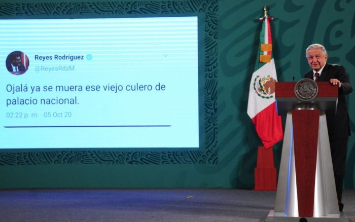 En la pantalla de la conferencia se pudo leer el mensaje “ojalá ya se muera ese viejo culero de palacio nacional”, atribuido a Reyes Rodríguez, quien ya había presentado una denuncia por el montaje.