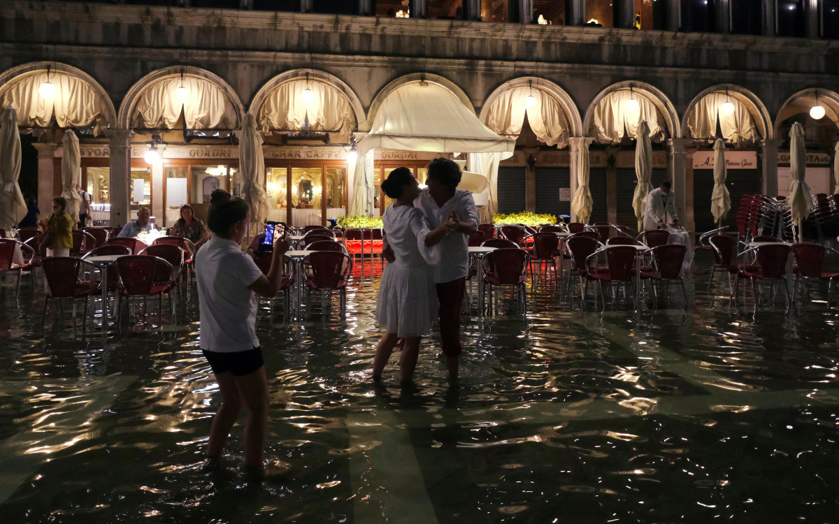 Sin embargo, el suceso del domingo por la noche fue menos dañino y las parejas en la plaza bailaron con música de piano y el agua casi hasta las rodillas, mientras los niños chapoteaban y remaban y los turistas vadeaban, zapatos en mano.