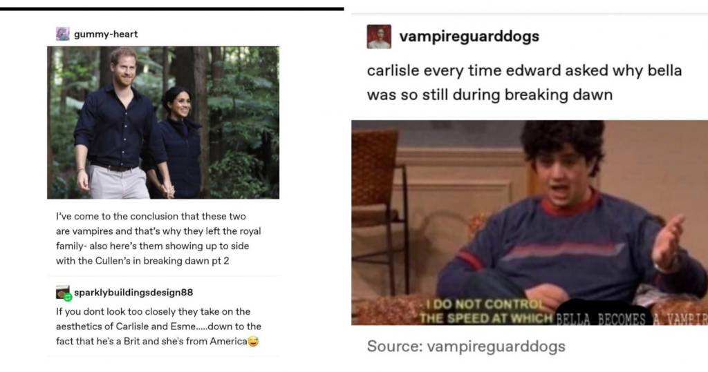 El meme comenta sobre el hecho de que estos dos personajes de la Saga Crepúsculo son similares al Príncipe Harry y Meghan Markle en las formas más divertidas, simplemente porque uno de ellos es británico, y están caminando en bosques que se parecen a Forks. ¡Este meme es definitivamente uno que los fanáticos encontrarán entretenido!