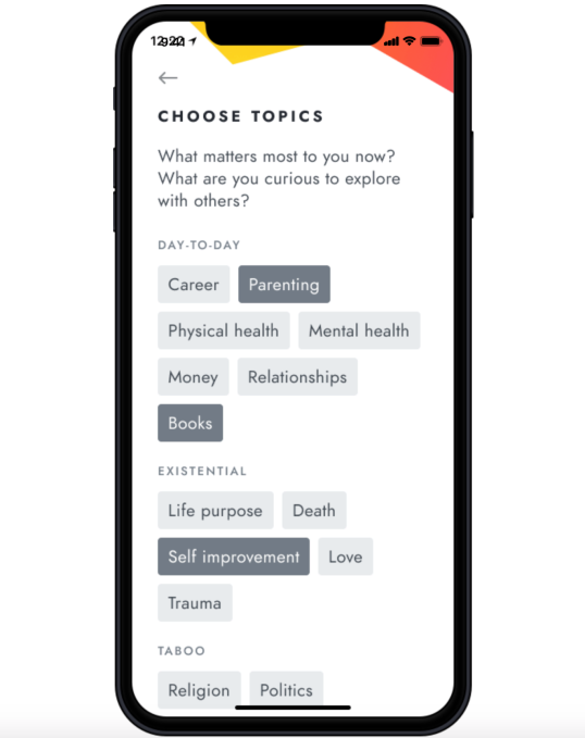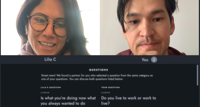 Los participantes eligen de una biblioteca de más de 250 preguntas “profundas”, luego se ponen en contacto con socios que desean explorar los mismos temas. Luego, confirman su asistencia a las reuniones digitales de bramante en su zona horaria y se registran cuando es hora de comenzar.