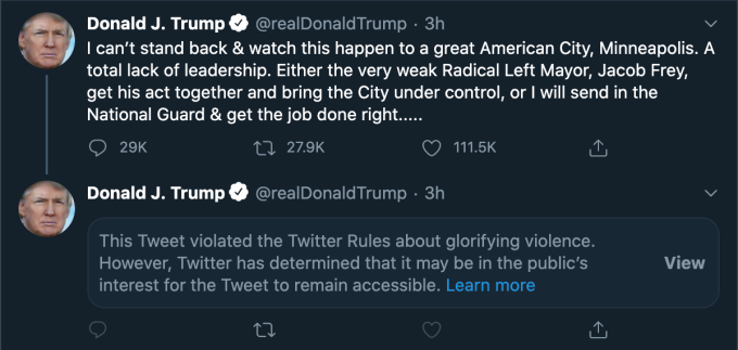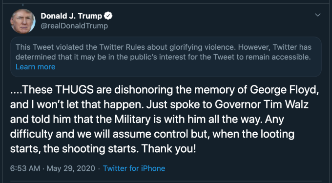 Al explicar su decisión de criticar la amenaza del presidente de EE. UU. De ordenar a los militares que disparen a los saqueadores en Minneapolis, la compañía escribe: “Este Tweet viola nuestras políticas con respecto a la glorificación de la violencia basada en el contexto histórico de la última línea, su conexión con la violencia y el riesgo de que pueda inspirar acciones similares hoy “.