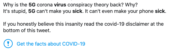 Tan fuerte, de hecho, que Twitter comenzó a aplicar una etiqueta a algunos tweets sobre COVID-19 y 5G, alentando a los usuarios a “conocer los hechos” sobre el virus. Como informó Business Insider, al hacer clic en la etiqueta se accede a una página que recopila fuentes que desacreditan reclamos con enlaces a páginas como BBC y Snopes. A principios de este año, la conspiración estaba vinculada a una serie de ataques incendiarios en torres 5G.
