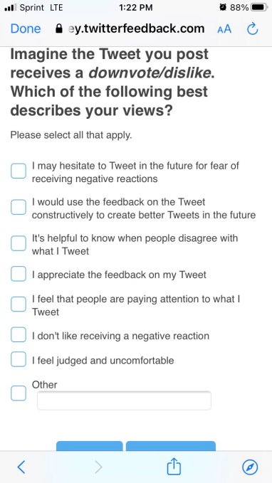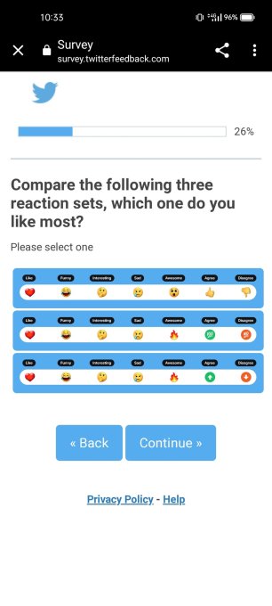 Las preguntas de la encuesta demostraron que Twitter es consciente de los desafíos que conlleva la introducción de reacciones emoji que podrían implicar sentimientos negativos. Preguntó a los encuestados cómo querrían aprovechar un voto negativo o un disgusto, por ejemplo, si usarían la reacción en lugar de responder a un tweet, o si también rechazarían tweets irrelevantes u ofensivos.