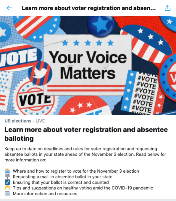“Twitter quiere capacitar a todas las personas elegibles para que voten en las elecciones estadounidenses de 2020, y estamos enfocados en ayudar a las personas a registrarse, comprender mejor el proceso de votación durante COVID-19, incluidas las opciones de votación anticipada, y sentirse informados sobre las opciones en su boleta. “La directora de políticas públicas de Twitter, Bridget Coyne, y el gerente senior de productos, Sam Toizer, escribieron en una publicación de blog sobre el anuncio.
