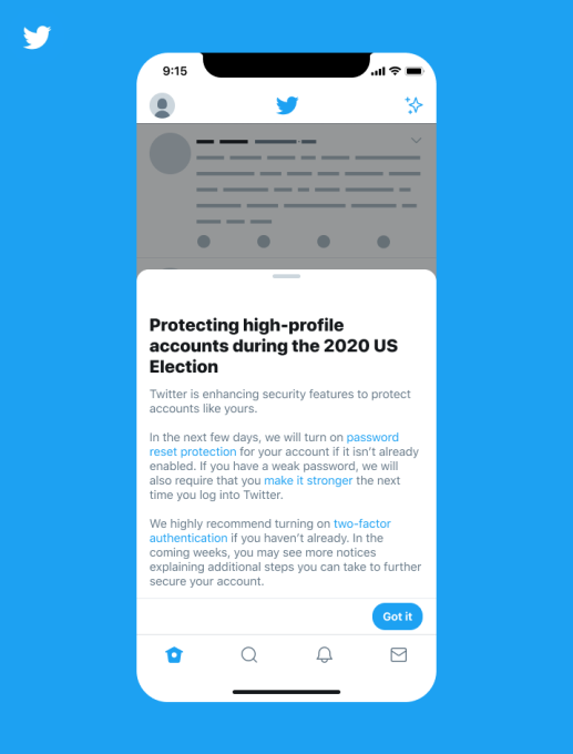 “Estamos dando el paso adicional de implementar de manera proactiva medidas de seguridad de cuentas para un grupo designado de cuentas de Twitter relacionadas con elecciones de alto perfil en los EE. UU. A partir de hoy, estas cuentas serán informadas a través de una notificación en la aplicación de Twitter de algunas de las medidas de seguridad de la cuenta inicial que requeriremos o recomendaremos encarecidamente en el futuro ”, dijo en un entrada en el blog anunciando el paso preventivo.