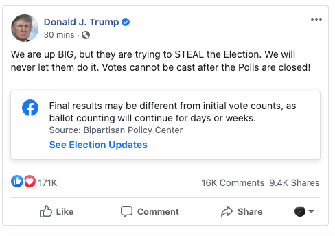 Luego de los comentarios hablados en los que Trump afirmó falsamente que había ganado las elecciones, Facebook dijo que comenzaría mensajes en ejecución a los usuarios de Facebook e Instagram señalando que “los votos todavía se están contando y no se proyecta un ganador”.