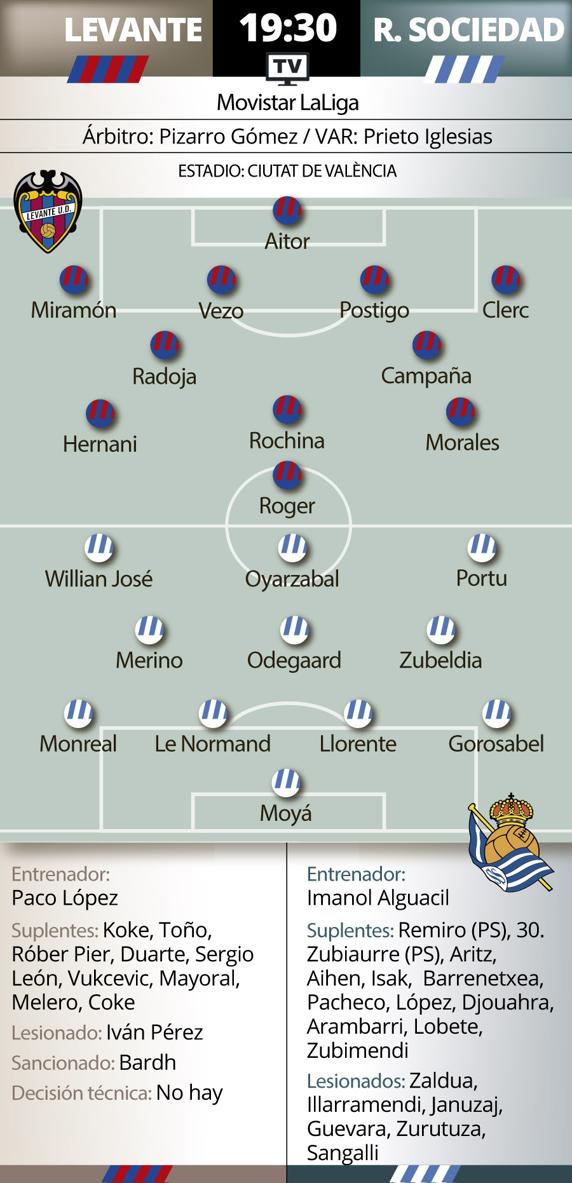 El primero de los cinco encierros que le restan a la Real es contra una peligrosa manada de buenos futbolistas. Un lunes de julio que depara la inquietante estampa de tener que lidiar con una monumental plaga de seis bajas por lesión, con una atmósfera asfixiante de 28 grados en pleno Alicante y con el impredecible efecto de actuar en un exilio: el Levante se ha mudado a La Nucía por las obras en el Ciutat de Valencia. Unas condiciones muy singulares que no conviene separar del papel previo al choque.